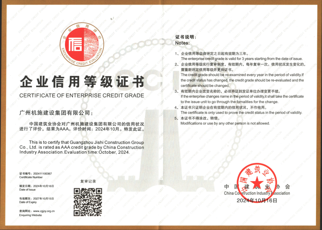 近日,中國建筑業(yè)協(xié)會公布《2024年度建筑業(yè)AAA級信用企業(yè)名單》,機施集團蟬聯(lián)“建筑業(yè)AAA級信用企業(yè)”稱號,目前已連續(xù)10年獲中國建筑業(yè)協(xié)會評為“建筑業(yè)AAA級信用等級”企業(yè)。?