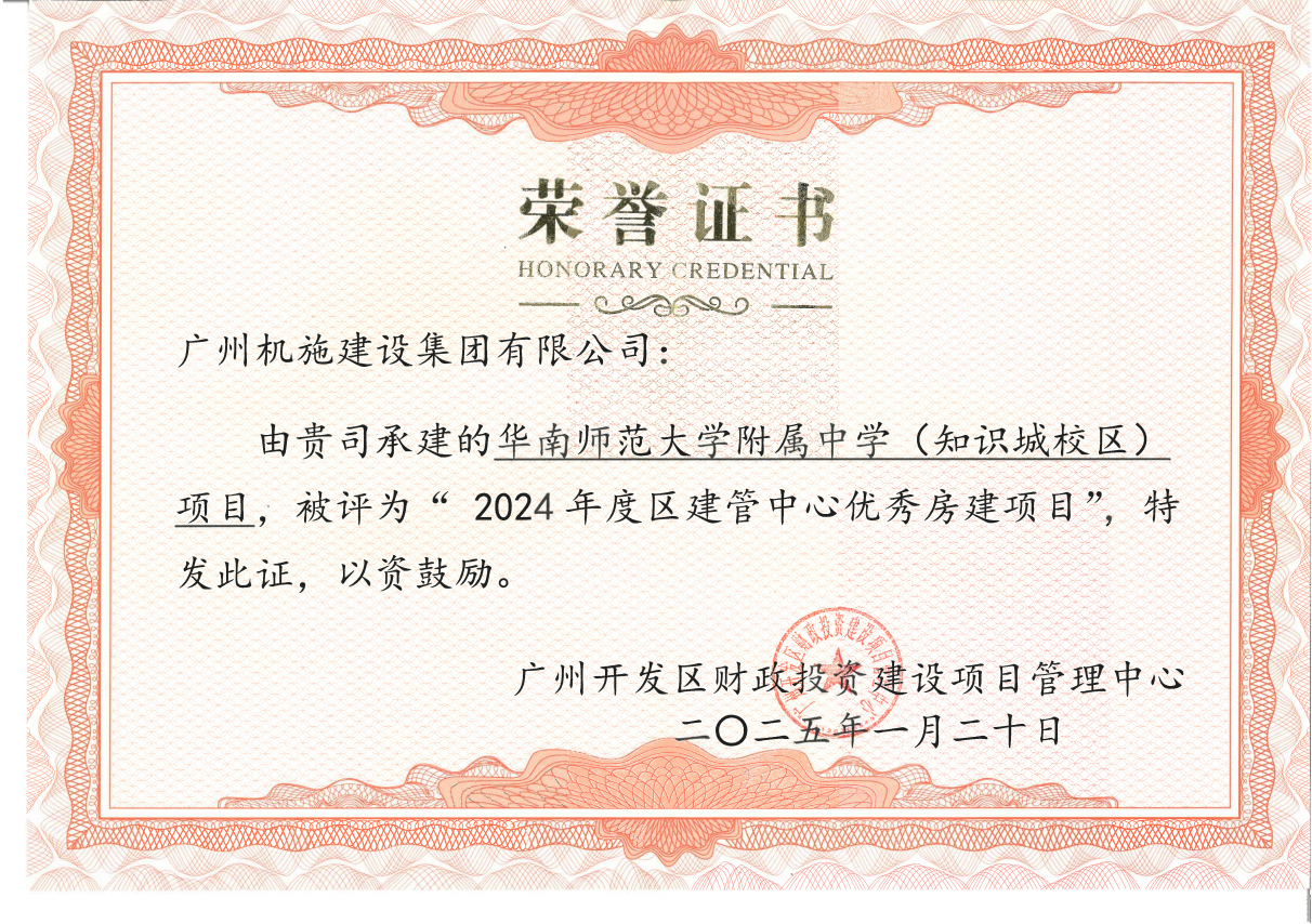 近日,機(jī)施集團(tuán)多個(gè)項(xiàng)目在 “2024年度黃埔區(qū)建管中心房建項(xiàng)目總結(jié)暨優(yōu)秀項(xiàng)目表彰大會(huì)”榮獲表彰。其中,華南師范大學(xué)附屬中學(xué)(知識(shí)城校區(qū))項(xiàng)目、禾豐片區(qū)九嶺政府儲(chǔ)備地塊新建小學(xué)項(xiàng)目榮獲“2024年度區(qū)建管中心優(yōu)秀房建項(xiàng)目”,福山福洞村安置區(qū)建設(shè)工程、黃埔區(qū)新建特殊教育學(xué)校項(xiàng)目、香雪小學(xué)整體翻新改造及新建國(guó)際乒乓球培訓(xùn)中心工程項(xiàng)目榮獲“年度表揚(yáng)項(xiàng)目”。